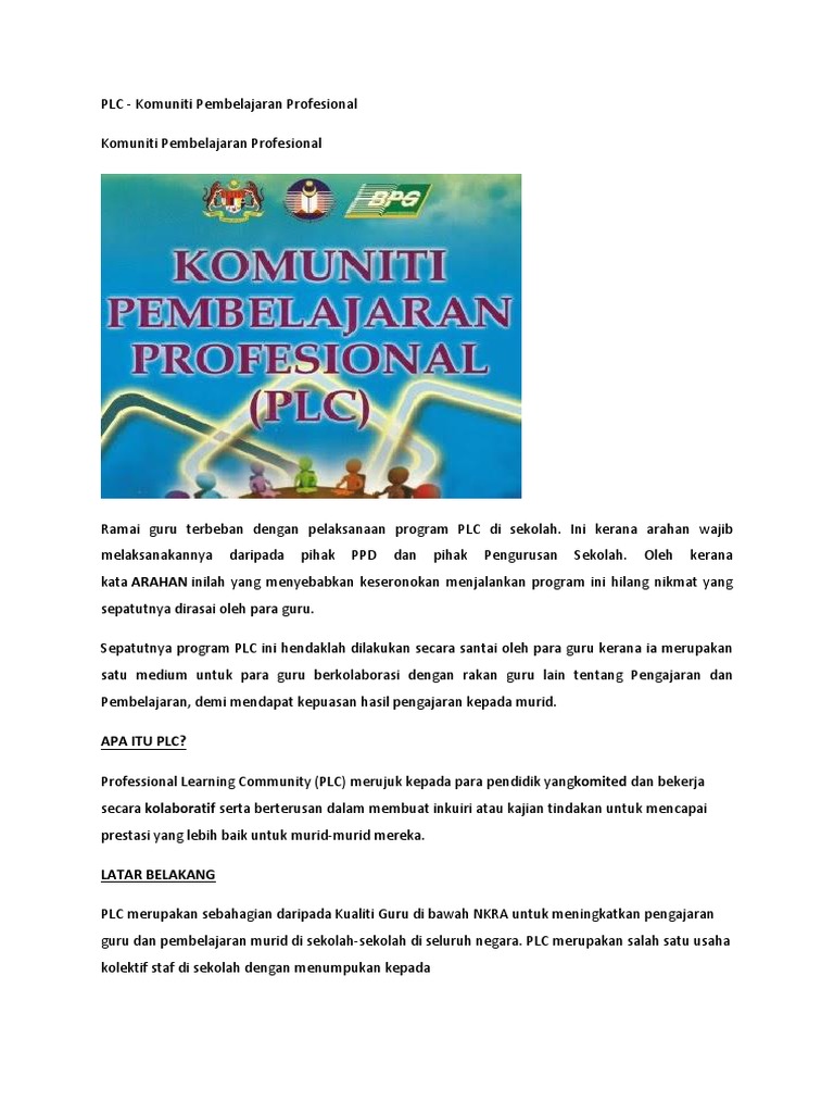 . View flipping ebook version of Cara Pelaksanaan PLC di SMK Taman Desa 2 published by WSWAI on 2019-05-15. PLC akan menjadi simbol usaha secara komprehensif dan cita-cita besar KPM bagi mencabar memotivasi serta. Pelaksanaan PLC dapat meningkatkan profesionalisme guru melalui amalan kolaboratif untuk meningkatkan pencapaian murid dan meningkatkan ketrampilan guru.